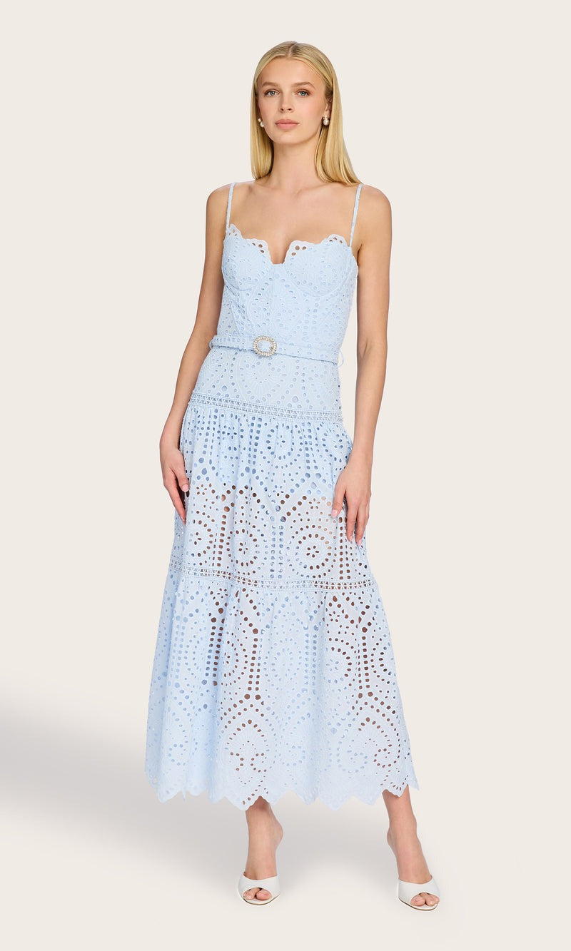 Step into summer romance with the Generation Love Zuria Cotton Eyelet Maxi Dress in Opal. This ethereal blue beauty is the dress you'll reach for all season long, combining delicate eyelet lace detailing with a sophisticated silhouette that feels both playful and polished. The dreamy pale blue hue evokes sun-drenched afternoons and coastal getaways.