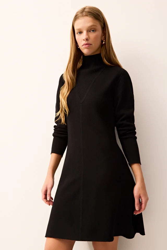 Effortless sophistication meets everyday comfort with the Brantley Dress in classic black. This mock neck swing dress features a relaxed, slip-on silhouette that skims the body beautifully without clinging, making it the perfect go-anywhere piece for your fall and winter wardrobe. The soft viscose-polyester blend drapes elegantly while the knee-length hem and long sleeves create a polished look that transitions seamlessly from coffee dates to dinner out. Style it with tall boots as shown for an on-trend monochromatic look, or dress it up with heels and jewelry for evening occasions.
