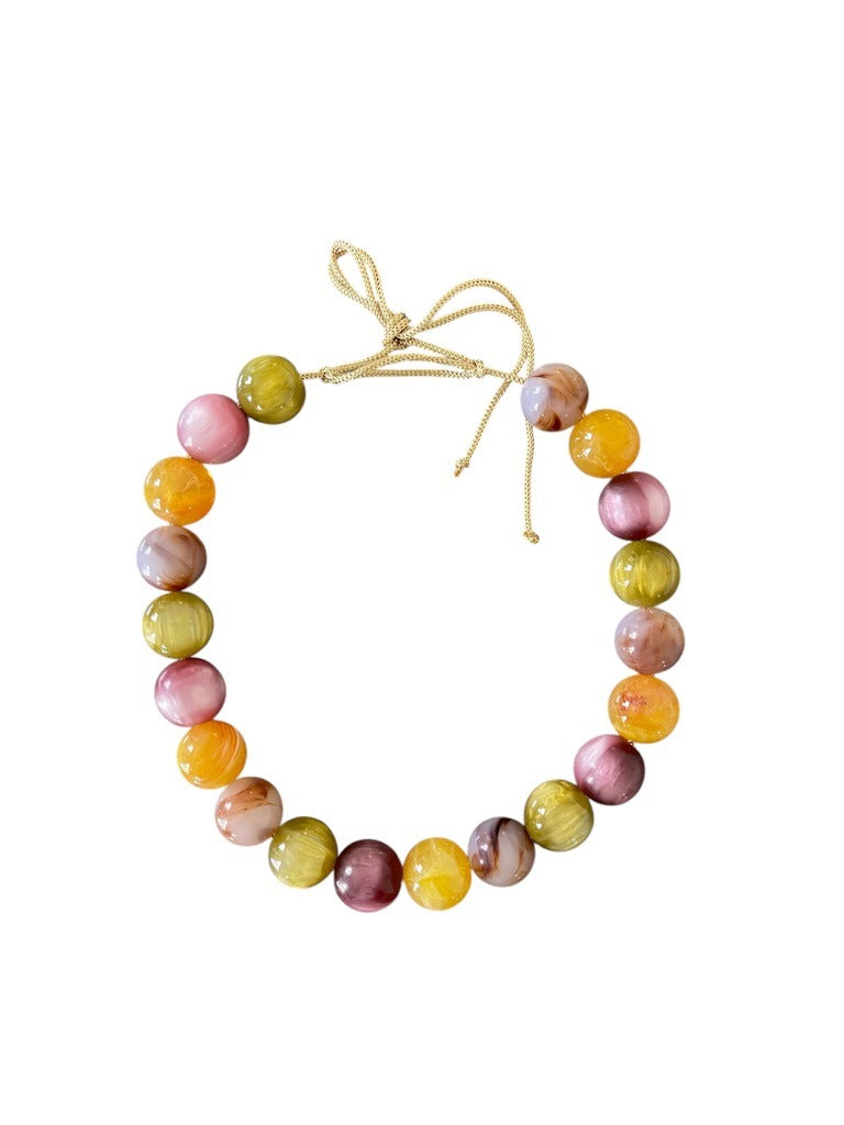 Add a vibrant pop of color to any outfit with the KMs Gems Chunky Beaded Necklace in August. This eye-catching statement piece features stunning oversized beads in a gorgeous palette of warm sunset hues including golden yellow, peachy coral, dusty rose, and olive green. Each bead's unique marbled pattern creates beautiful depth and dimension, making every necklace truly one-of-a-kind.
