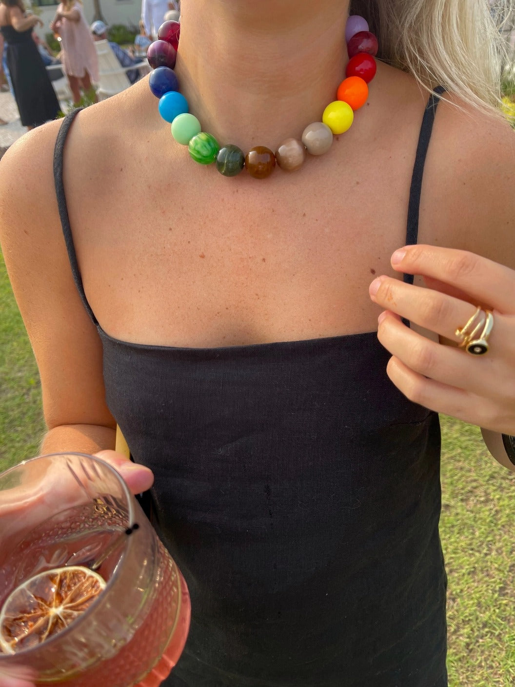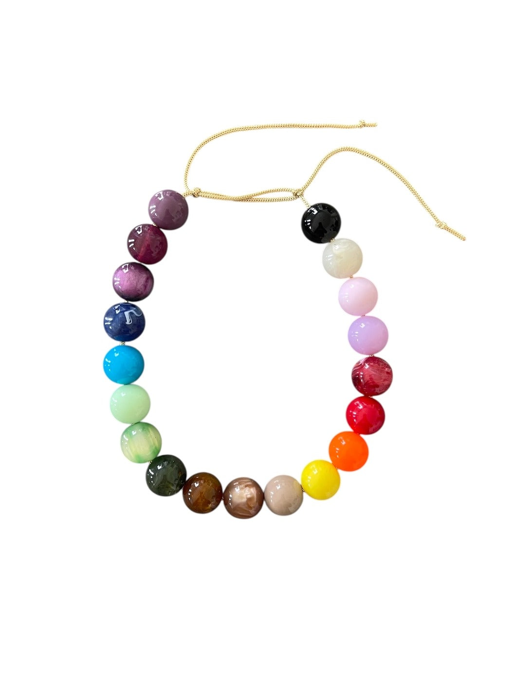Brighten any outfit with the KMs Gems Chunky Beaded Necklace in Rainbow. This joyful statement piece celebrates color with a stunning spectrum of vibrant beads arranged in a complete rainbow gradient. From deep purples and blues through cheerful greens, sunny yellows, vibrant oranges, and bold reds, each glossy bead brings personality and playful sophistication to your look.