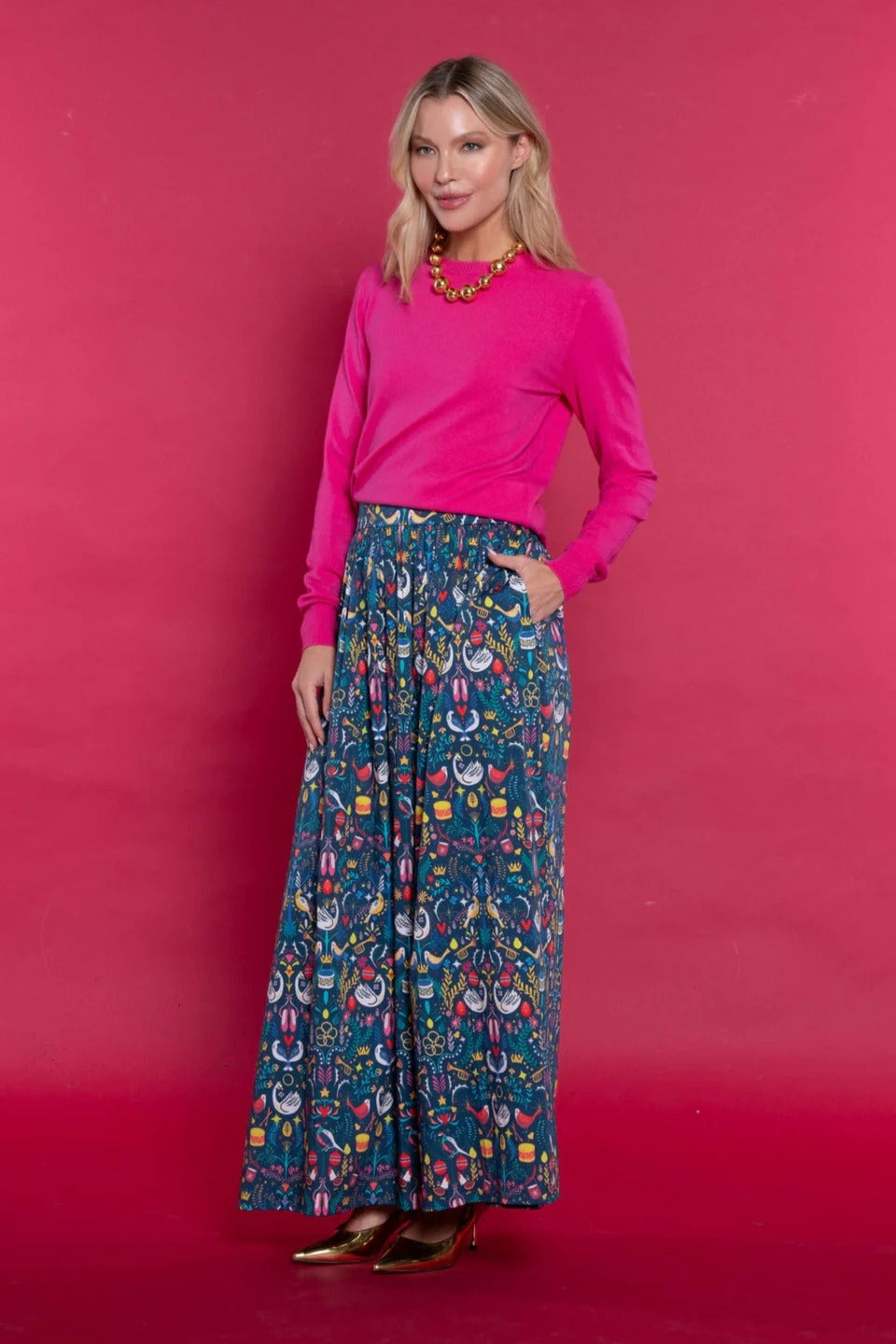 Festive and effortlessly feminine, the Wesley Skirt by Sheridan French brings cheerful sophistication to the season. Crafted in a vibrant Twelve Days Navy print inspired by classic holiday motifs, this long, flowy skirt makes a statement while staying beautifully wearable. The smocked back waistband ensures a comfortable, flattering fit, while hidden side pockets add everyday ease.