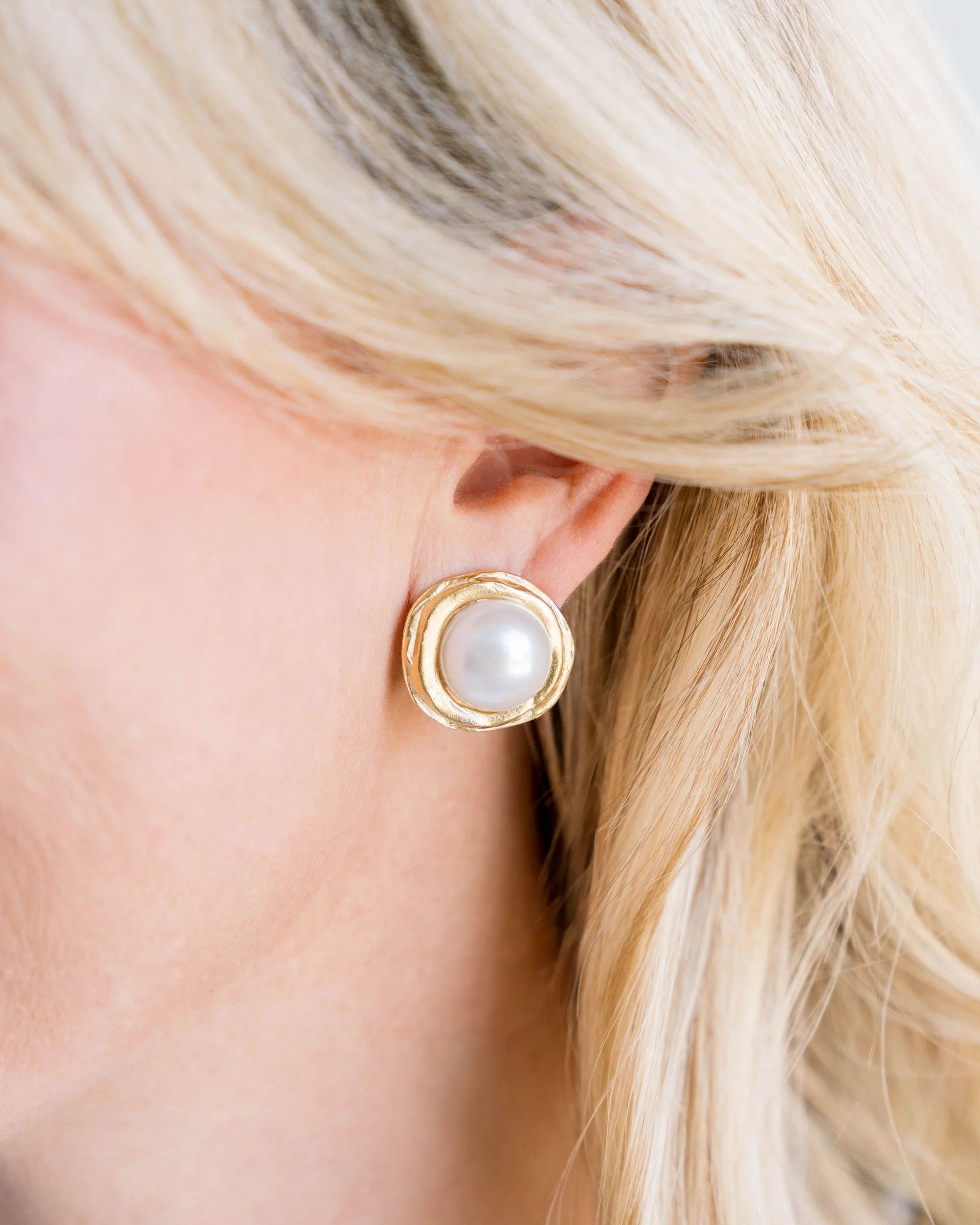 Timeless elegance meets artisanal craftsmanship with the Susan Shaw Gold Pearl Pierced Earrings. These classic studs feature luminous white coin pearls framed in handcast gold, creating a sophisticated yet organic look.