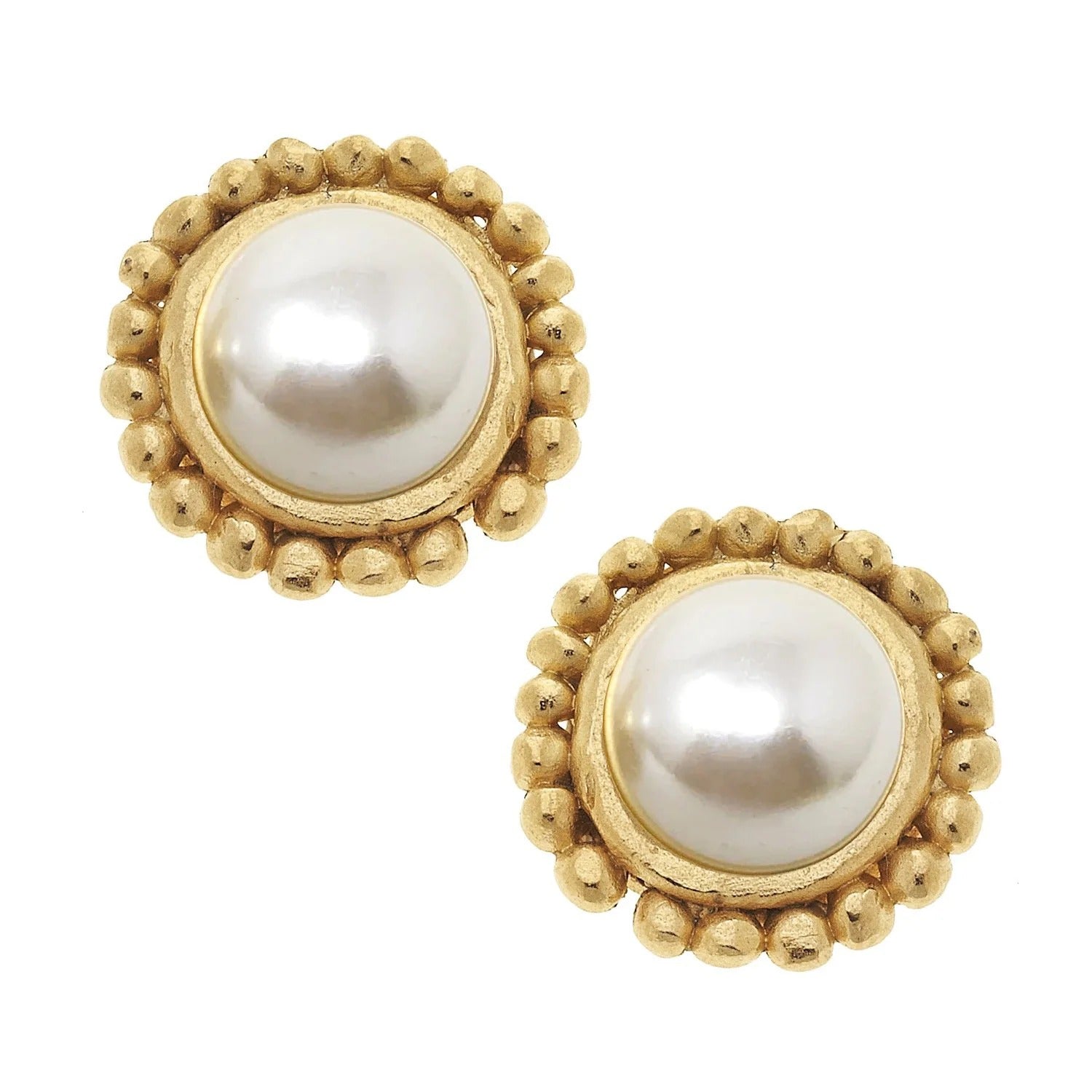 Add timeless sophistication to any look with the Susan Shaw Gold with Coin Pearl Pierced Earrings. These exquisite handcrafted studs showcase lustrous white coin pearls nestled within beautifully textured gold bezels that create an organic, artisanal finish. The substantial yet wearable size makes them perfect statement earrings for both professional settings and special occasions. The rich 24k gold plating catches the light beautifully while the classic pearl centers add refined elegance that complements everything from crisp blazers to flowing dresses.