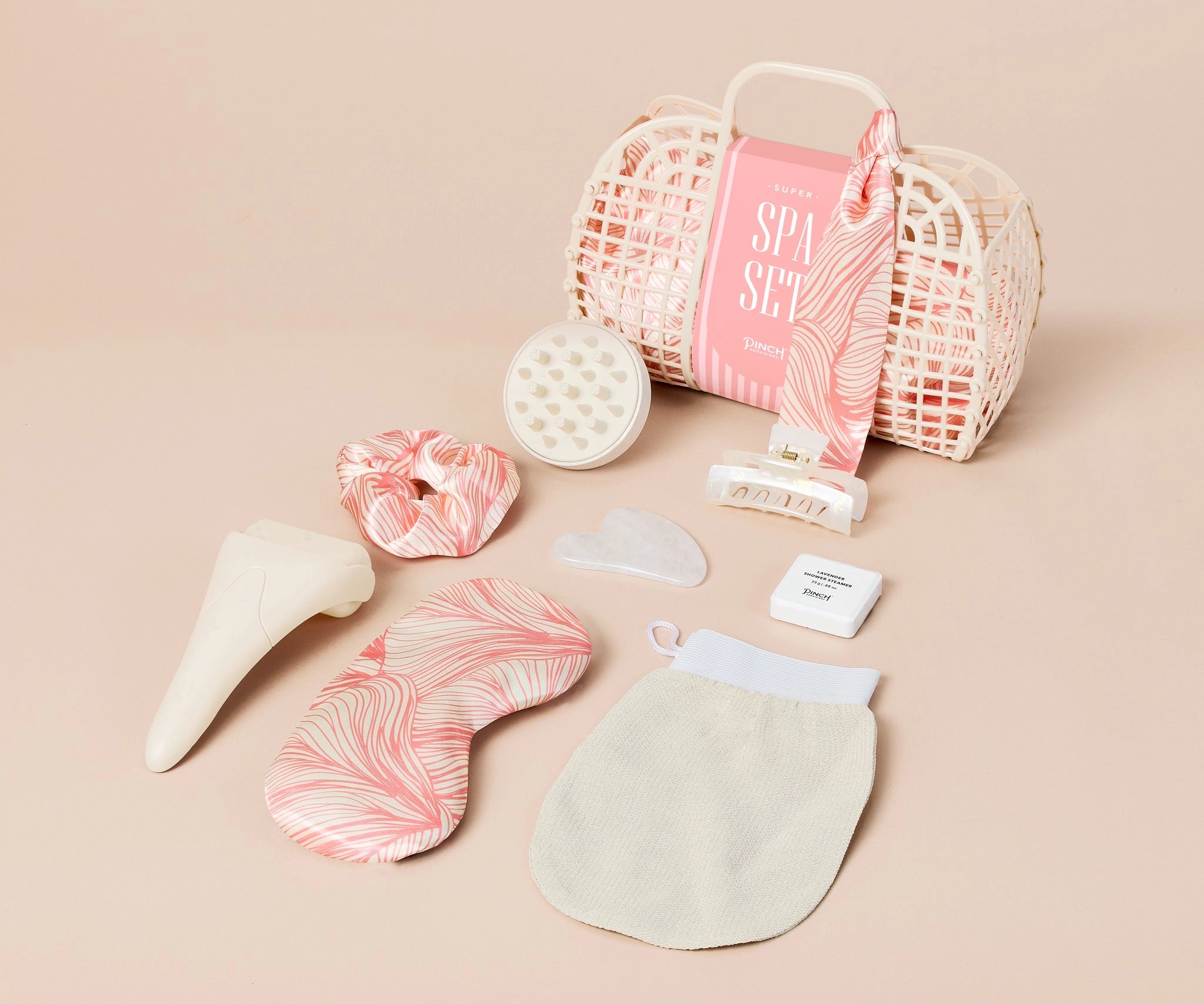 Transform any space into a luxurious retreat with the Pinch Provisions Super Spa Set. This thoughtfully curated self-care collection features eight premium spa essentials in a gorgeous coral abstract pattern that's not too pink, not too peach - making it perfect for gifting to anyone. The complete set arrives beautifully packaged in a nostalgic ivory jelly tote with coordinating drawstring bag and silk-like scarf, creating an instantly giftable "self-carryall" that's ready for Mother's Day, Easter, or any special occasion. From the full-size ice roller for facial massage to the silky sleep mask for ultimate relaxation, each piece is designed to deliver a professional spa experience at home. The sophisticated coral palette and premium quality make this spa set a standout choice for beauty lovers who appreciate both style and self-care.