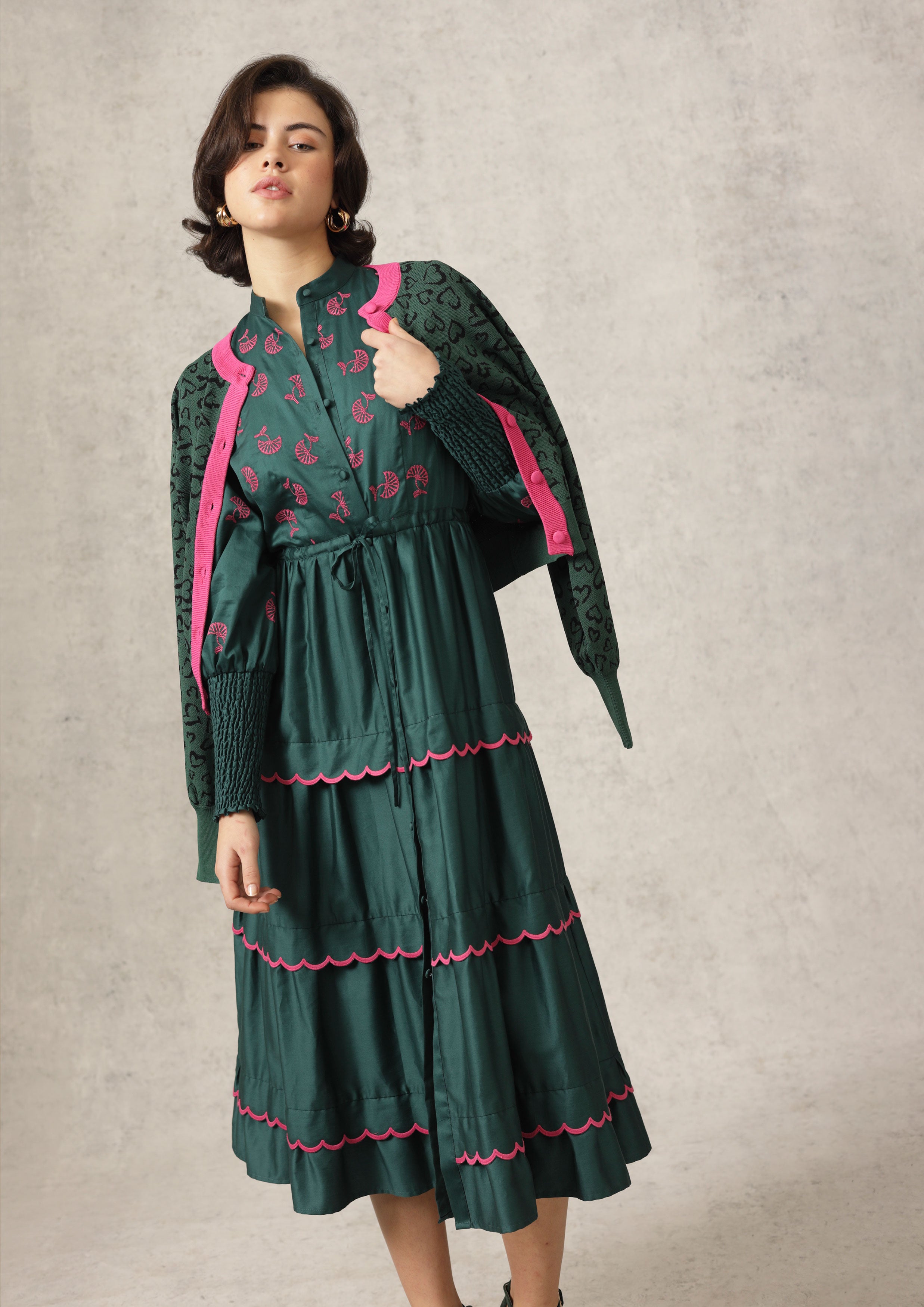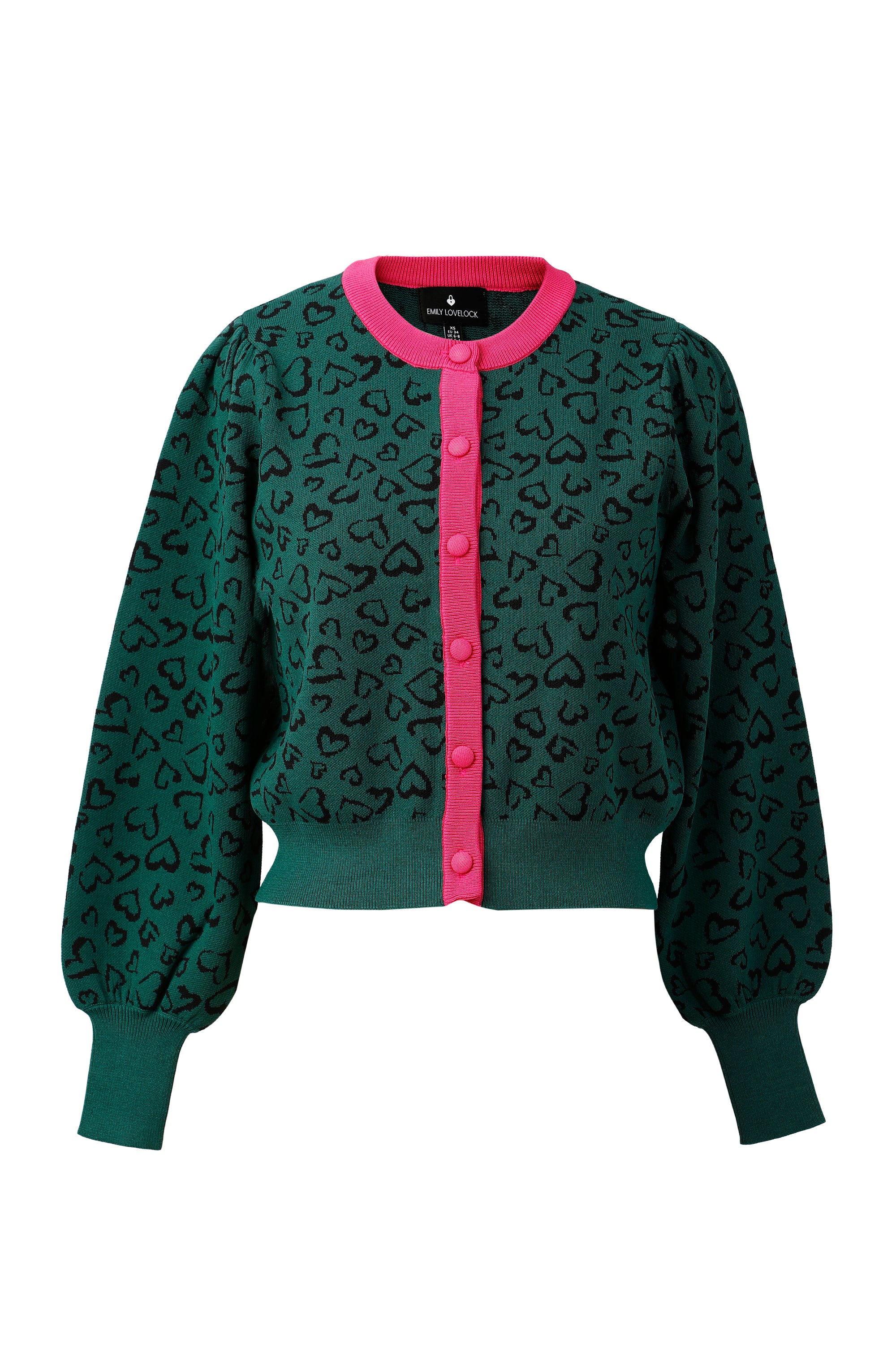 Charming and full of personality, the Sherry Cardigan by Emily Lovelock is a bold take on classic knitwear. This dark moss cardigan features an allover heart motif with playful pops of pink trim and covered buttons for a touch of whimsy. The cropped silhouette and slightly puffed sleeves create a feminine shape that layers beautifully over dresses, blouses, or tees.