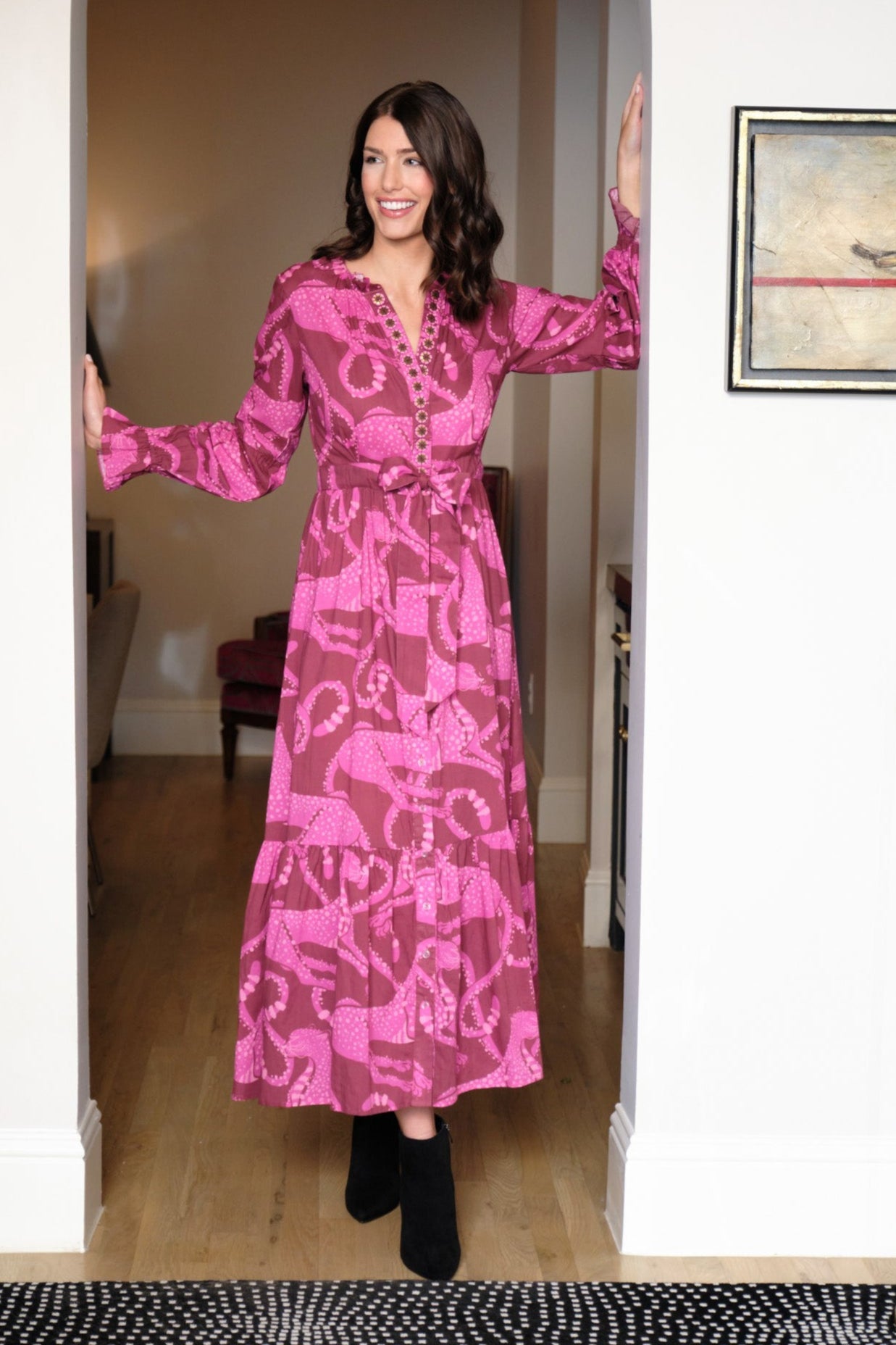 Our Britt Dress is the perfect piece to take your wardrobe into Fall. Made of cotton lycra, this maxi dress is easy and comfortable, making it perfect for layering into cool nights. The dress features pockets, a flattering hand embellished neckline, and an elastic tie waistline that ensures a perfect fit.
