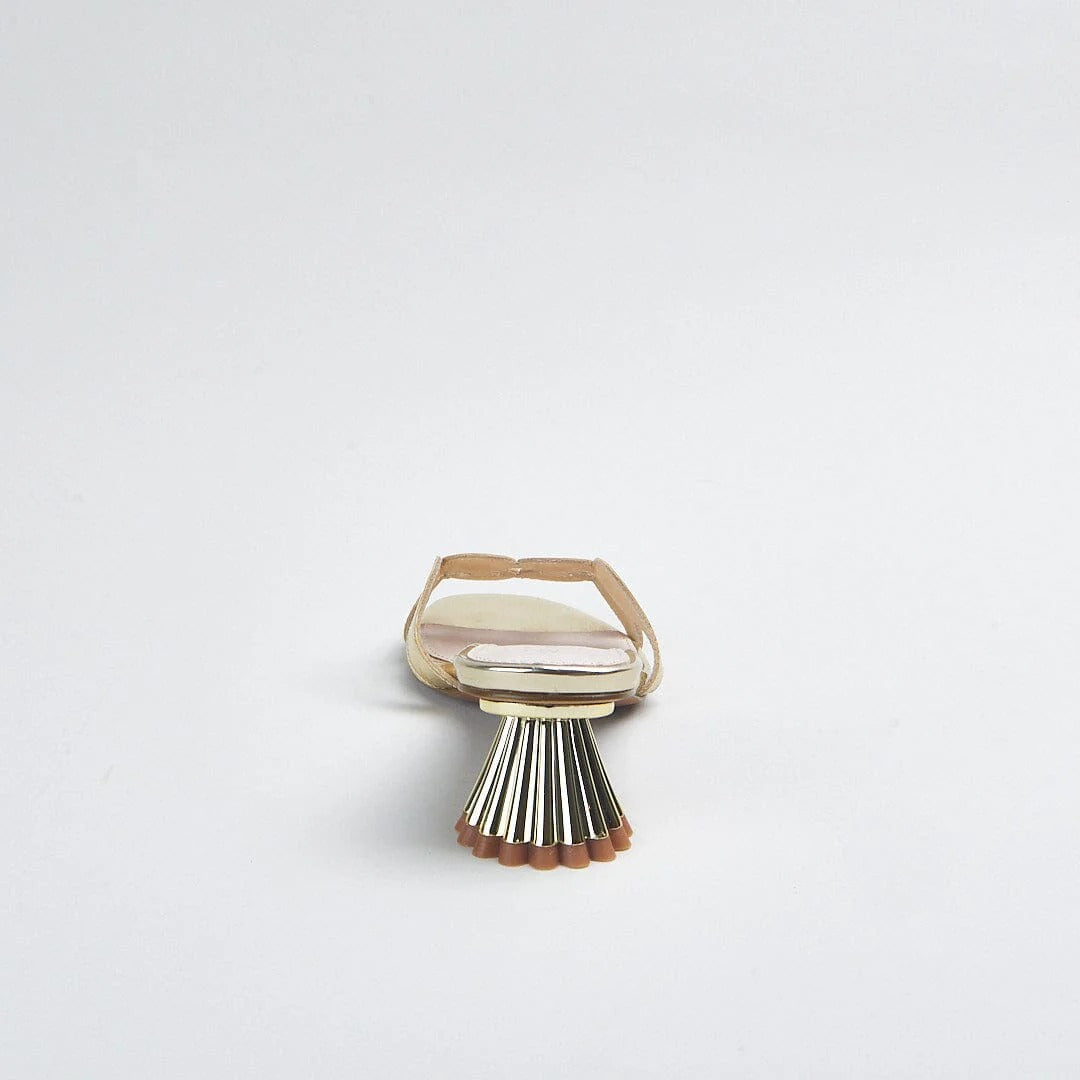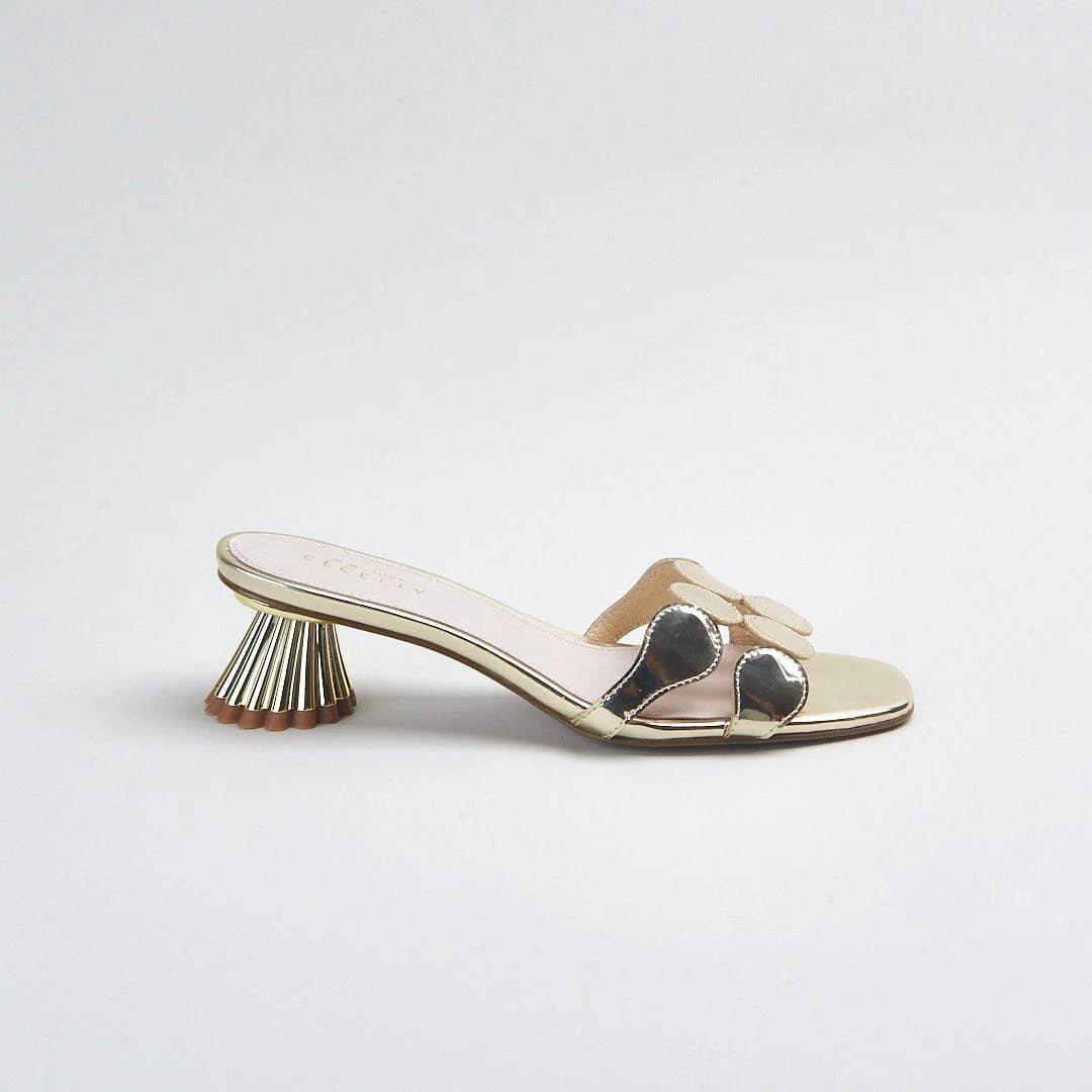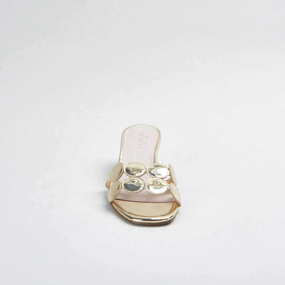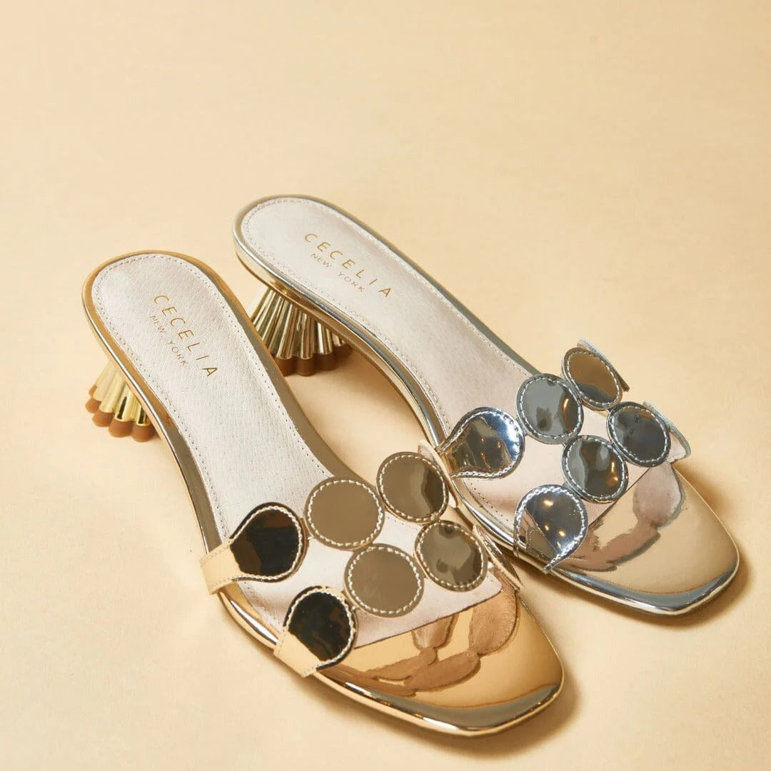 Step into effortless glamour with the Cecelia New York Bunny Heel, one of the brand's most beloved silhouettes reimagined in stunning gold metallic. This elegant slide sandal features a sleek circular embellishment across the toe strap and a sculptural fluted heel that delivers the perfect balance of modern sophistication and playful personality. The luxurious gold specchio finish catches the light beautifully, making these heels ideal for weddings, cocktail parties, date nights, or elevating your everyday wardrobe. With a comfortable 2-inch heel height and padded footbed, these Cecelia New York slides offer all-day wearability without sacrificing style. The true-to-size fit and premium leather construction ensure these statement heels will become your go-to for any occasion that calls for polished elegance.
