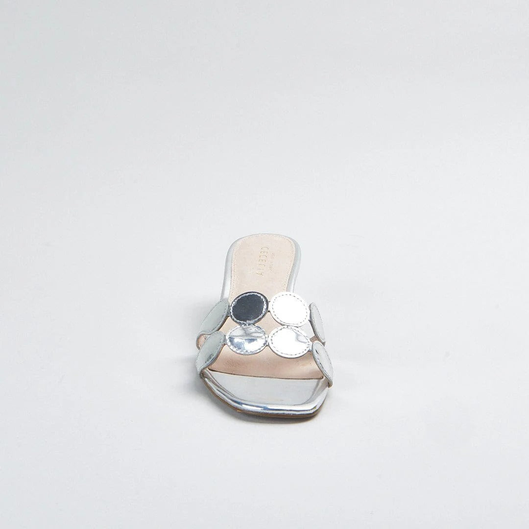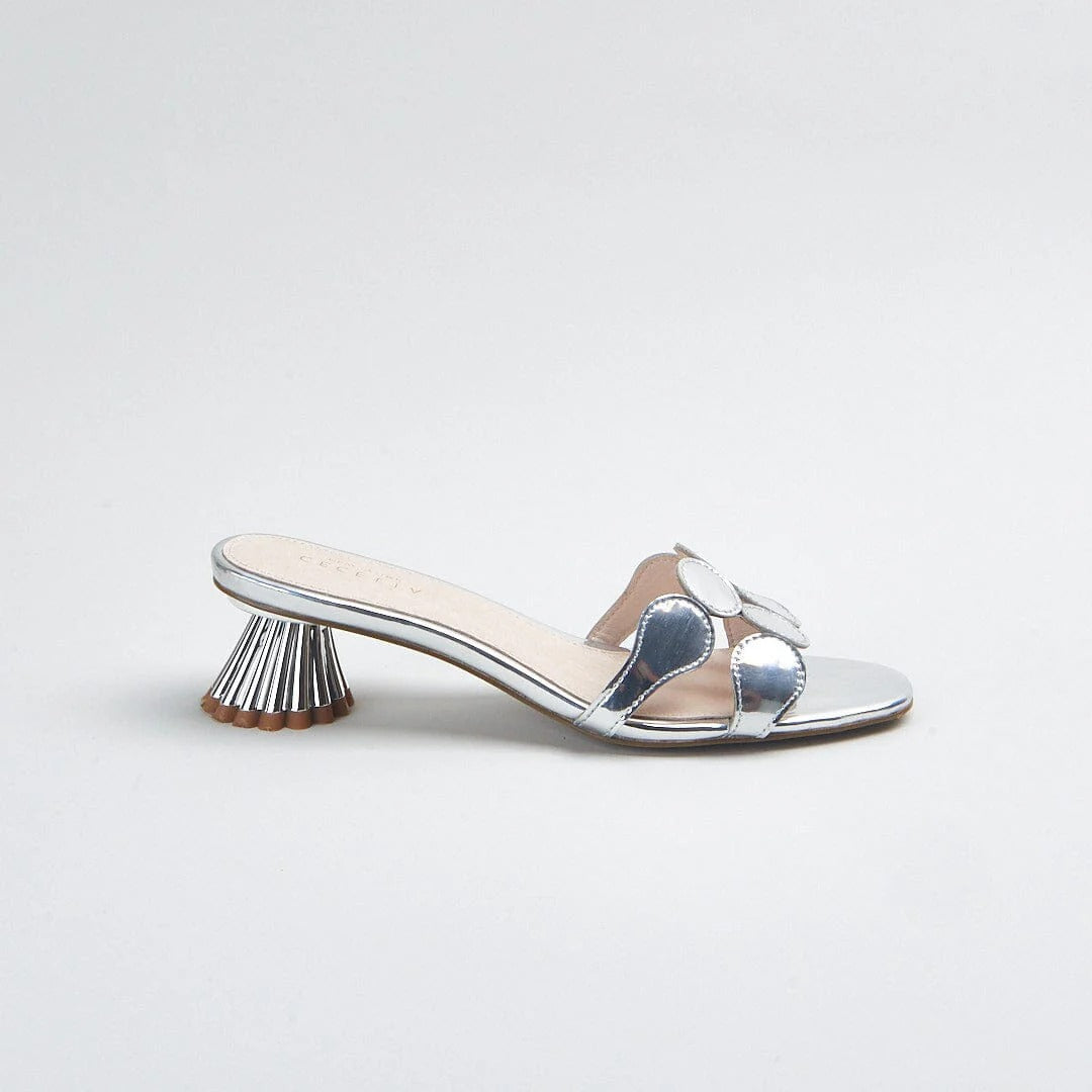 Step into effortless elegance with the Cecelia New York Bunny Heel, one of the brand's most beloved silhouettes reimagined in stunning silver metallic. This sophisticated slide sandal features eye-catching circular mirror-like discs across the toe strap, creating a bold yet refined statement piece that transitions seamlessly from day to evening. The sculptural fluted heel adds architectural interest while providing comfortable 2-inch lift, making these silver heels perfect for weddings, cocktail parties, or elevating your everyday wardrobe. The glossy metallic finish and modern geometric details ensure you'll shine at any occasion while enjoying all-day comfort with the padded footbed and true-to-size fit.