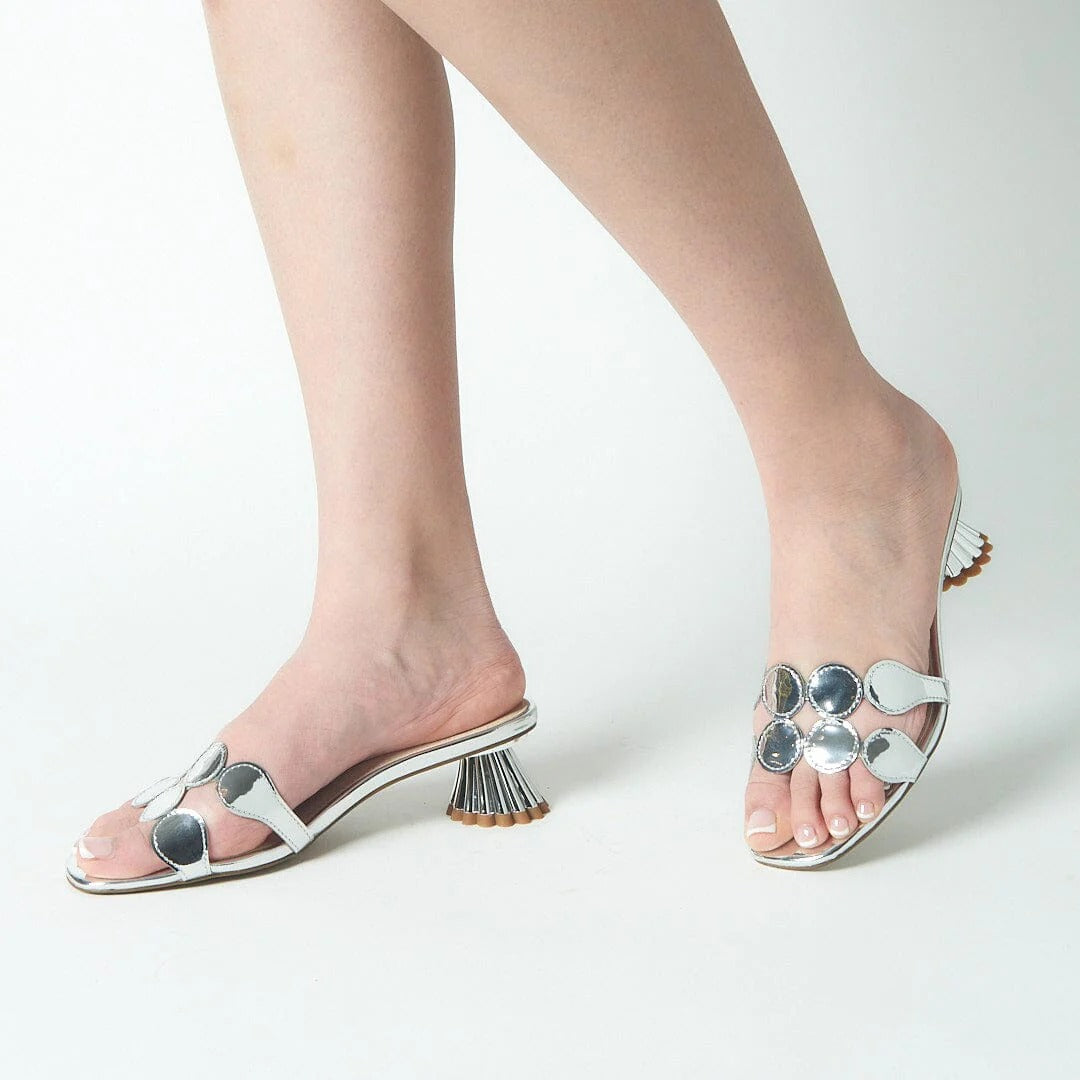 - Silver specchio leather upper with circular mirror disc embellishments