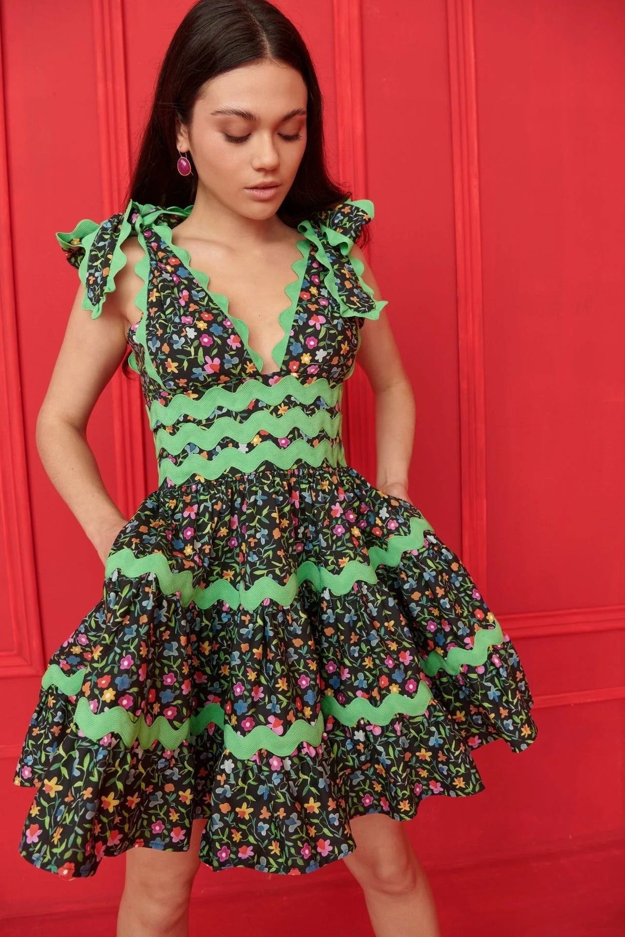 Dance into summer nights with the CELIA B. Cheli Dress Midnight, a vibrant celebration of feminine charm and playful sophistication. This enchanting fit-and-flare dress features a kaleidoscopic floral print in colorful blooms against a black backdrop, beautifully contrasted by bright green ric-rac trim that adds whimsical detail to every tier. The flattering deep V-neckline and adjustable shoulder ties create a customized fit, while the tiered cotton skirt moves beautifully with every step. Perfect for garden parties, date nights, or any occasion where you want to make a joyful statement.
