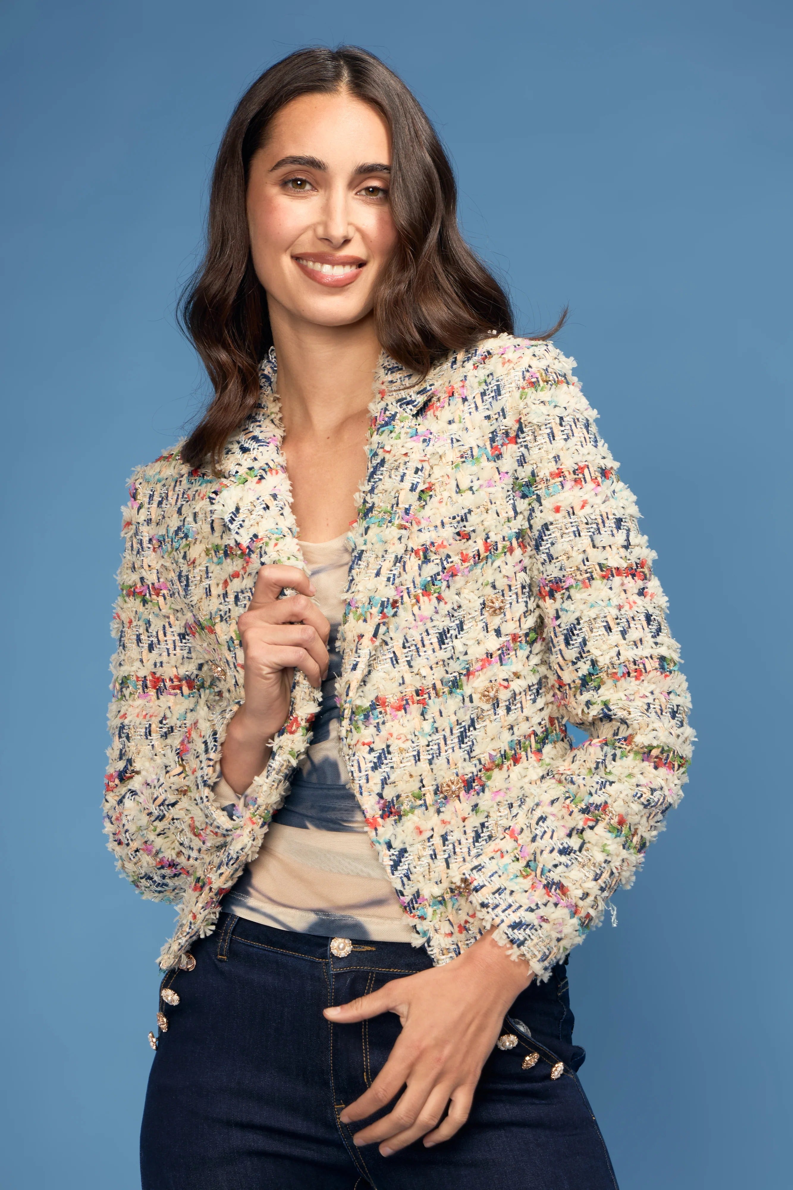 Add texture, color, and timeless polish to your wardrobe with the Confetti Bouclé Open Jacket by Oo La La. Woven from richly textured ivory bouclé with playful flecks of color throughout, this jacket strikes the perfect balance between classic sophistication and modern charm. Its open-front design and tailored silhouette make it ideal for layering over blouses, knits, or dresses.