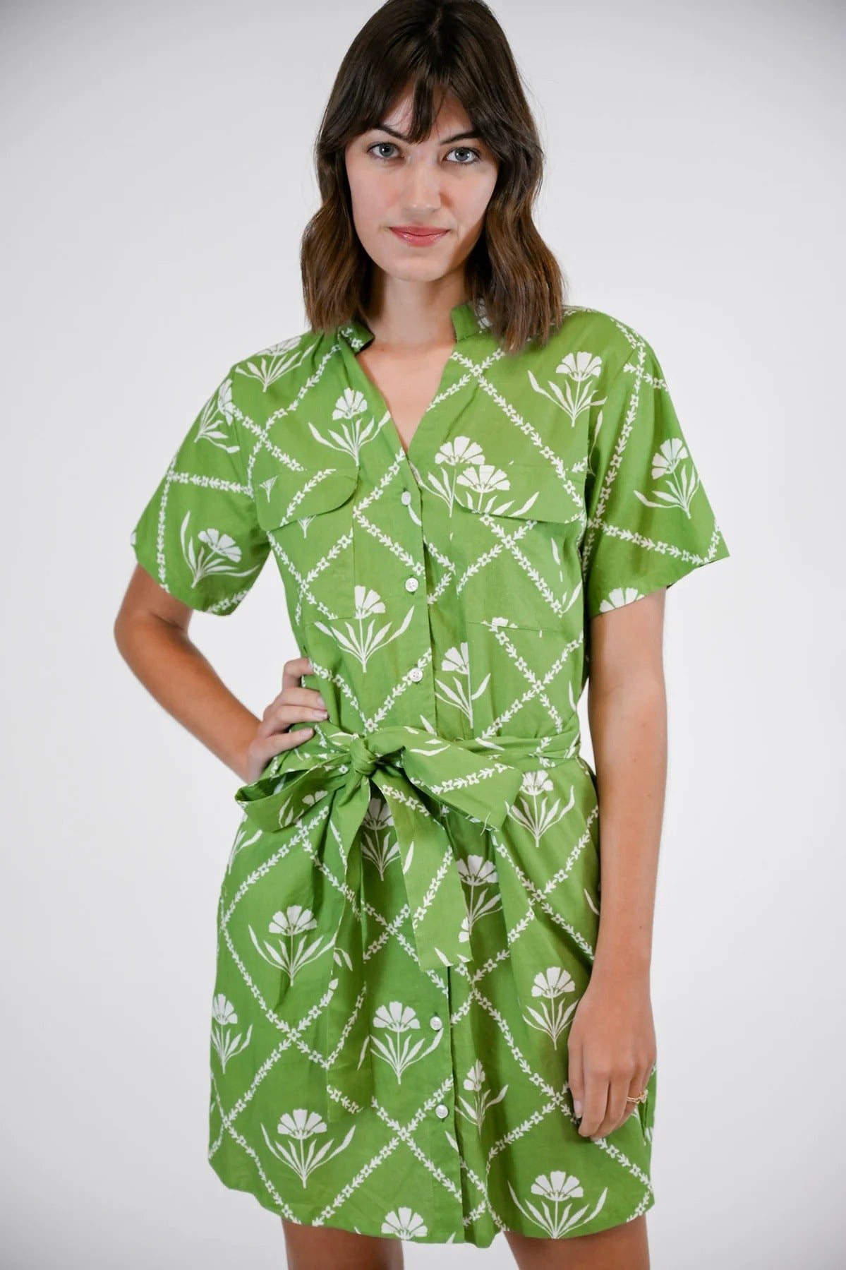 Embrace effortless sophistication with the VICTORIA DUNN Delaney Dress in the stunning Garden Lattice print. This timeless shirt dress combines classic tailoring with modern comfort, featuring a beautiful sage green base adorned with white floral motifs arranged in a diamond lattice pattern. Crafted from 100% cotton poplin and fully lined, this versatile piece offers a relaxed yet polished silhouette that's perfect for everything from weekend brunches to casual office days. The thoughtful design includes a flattering tie waist that cinches beautifully, creating an hourglass shape while maintaining comfortable movement throughout your day.