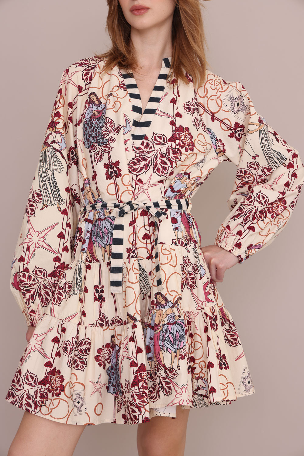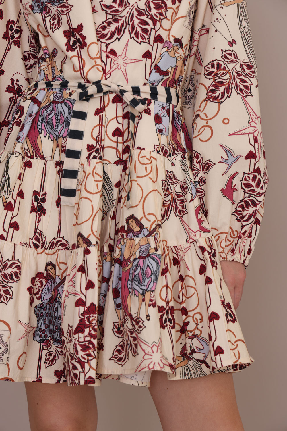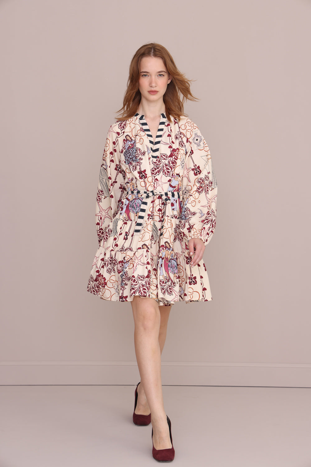 Step into effortless sophistication with the Vero Alfie Epoque Mini Dress in ecru. Featuring a whimsical mix of vintage-inspired illustrations and bold floral motifs, this dress is a true statement piece. The striped V-neckline and matching belt add a modern contrast, while the long sleeves and tiered skirt create a flattering, feminine silhouette. Lightweight with graceful movement, the Epoque Mini Dress is perfect for transitioning from daytime outings to evening occasions with ease.