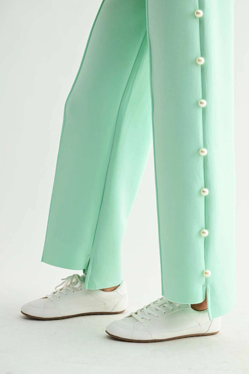 Elevate your everyday style with the Joh Farrah French Scuba Pearl Long Pant in stunning mint green. Crafted from luxurious French scuba fabric, these wide-leg pants feature an elegant pearl button detail running down each side seam that adds sophisticated glamour to the relaxed silhouette. The high-quality scuba material drapes beautifully while offering incredible comfort and stretch, making these pants perfect for both casual days and elevated occasions. The elastic waistband ensures a perfect fit, while the slightly flared legs create a flattering, elongated line. Style with the matching Francine pearl hoodie for a chic coordinated look, or pair with a simple tee and sneakers for effortless weekend elegance.