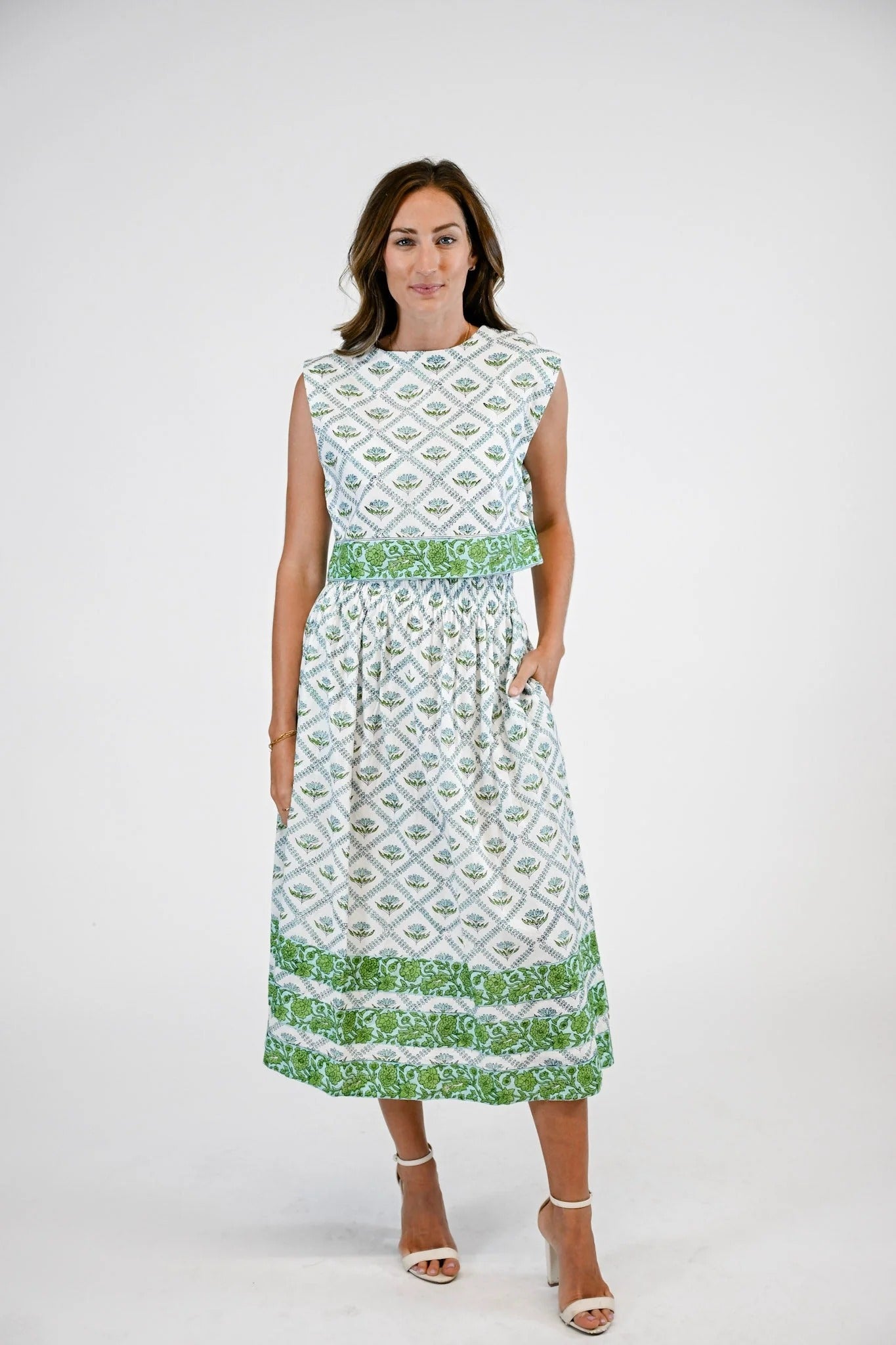 Embrace effortless elegance with the Clara The Label Freya Blouse in the stunning Flora print. This sophisticated cotton blouse features a beautifully hand-blocked botanical pattern in fresh greens and blues on a crisp white base, creating an artisan-crafted piece that elevates any wardrobe. The relaxed, slightly boxy silhouette offers comfortable movement while maintaining a polished appearance, making it perfect for everything from casual weekend brunches to sophisticated work meetings. The jewel neckline and subtle capped sleeves create a timeless feminine shape, while the banded trim detail at the hem adds refined structure. Pair with the matching Freya Skirt for a coordinated look, or style with tailored trousers and statement jewelry for modern sophistication.