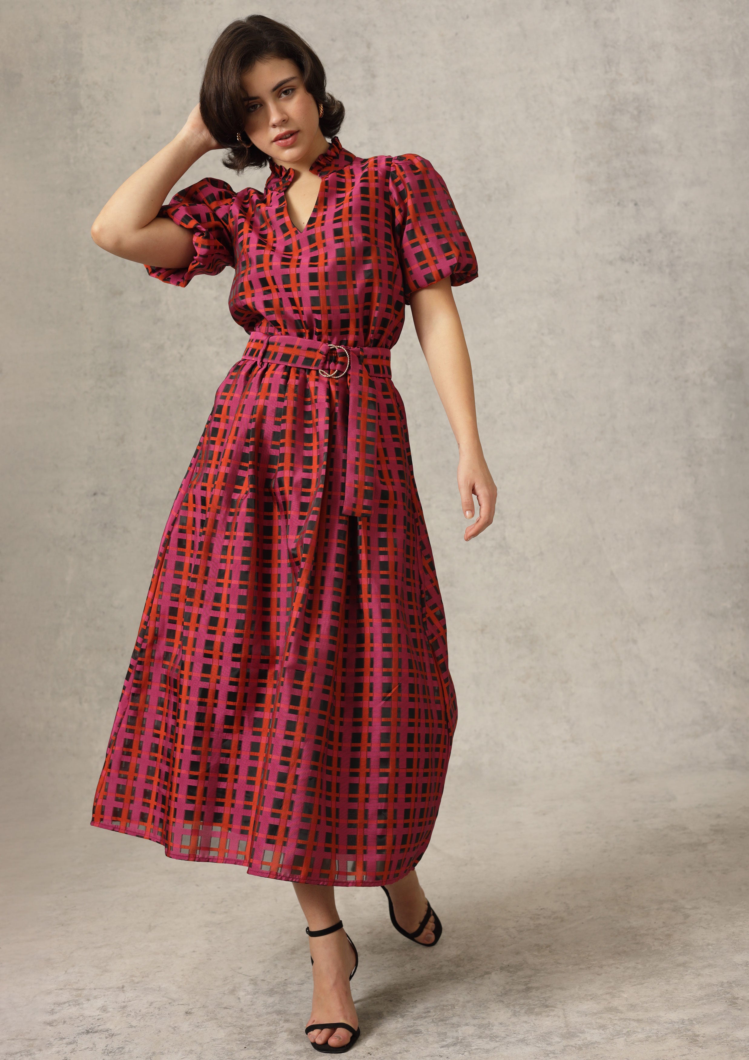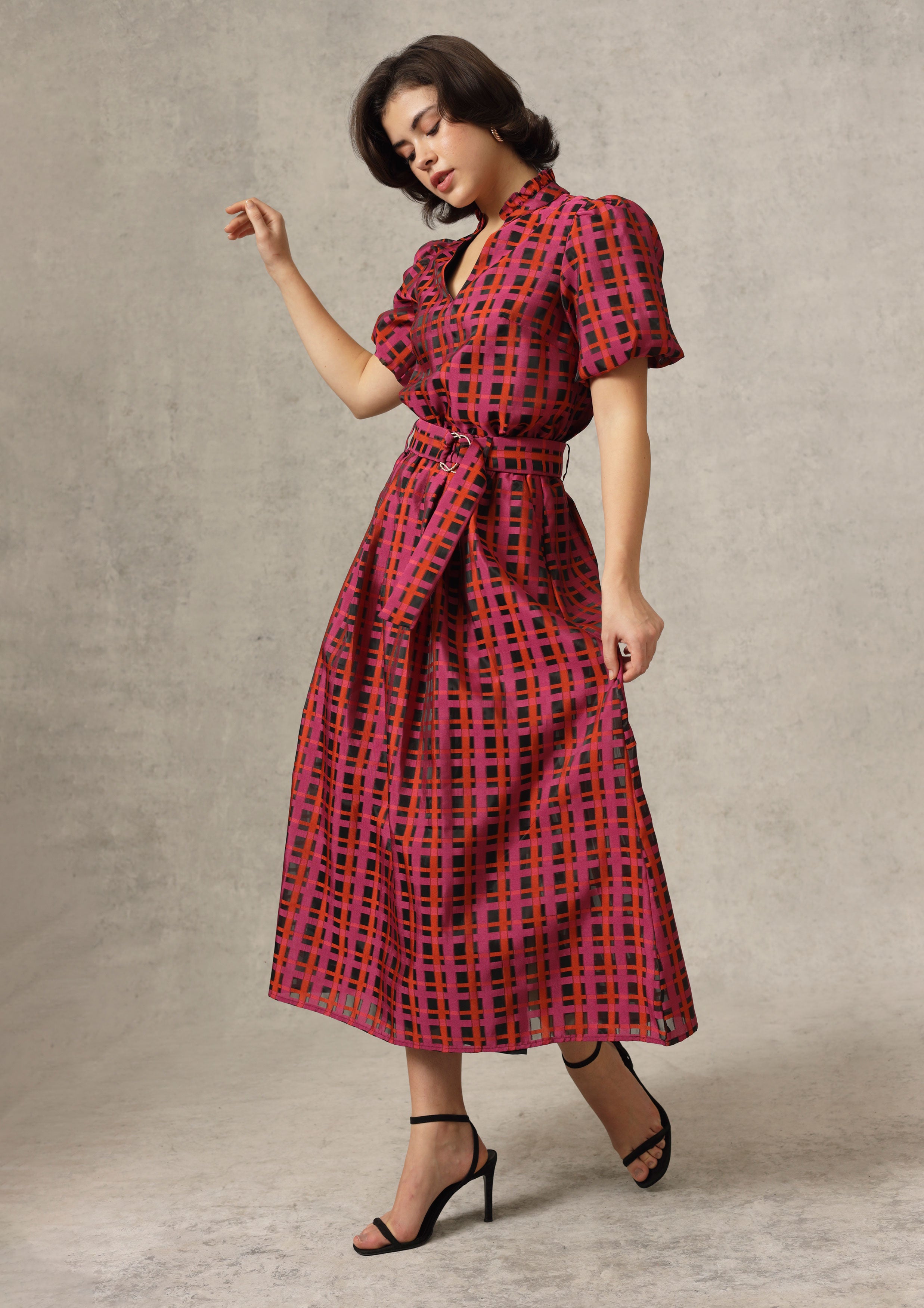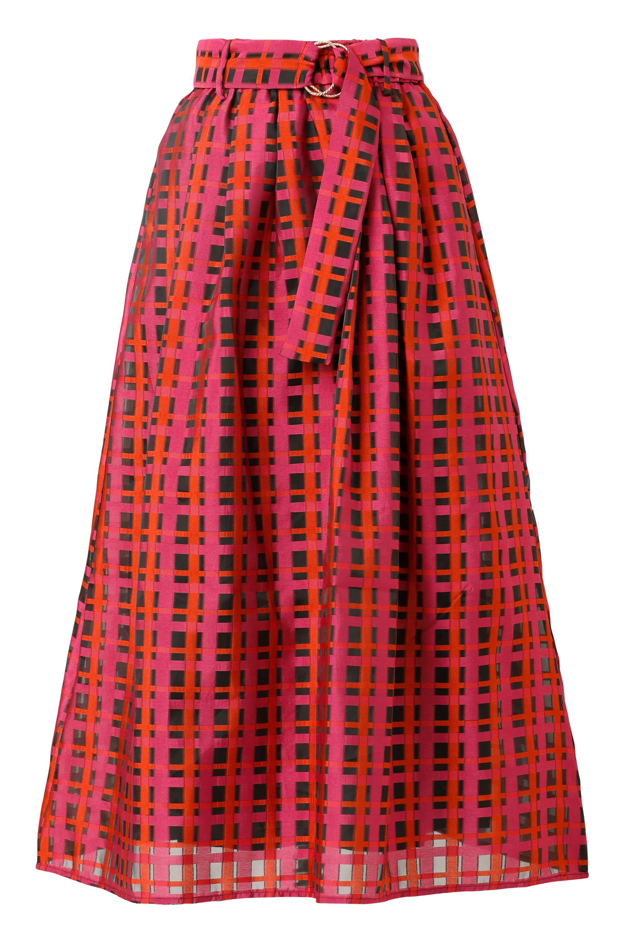 This mesmerizing maxi skirt features a vibrant crimson base layered with a modern geometric check pattern in rich shades of red, pink, and black. Crafted from a lightweight, semi-sheer fabric with beautiful movement, it creates a flattering, flowy silhouette perfect for special occasions or elevated everyday style.
