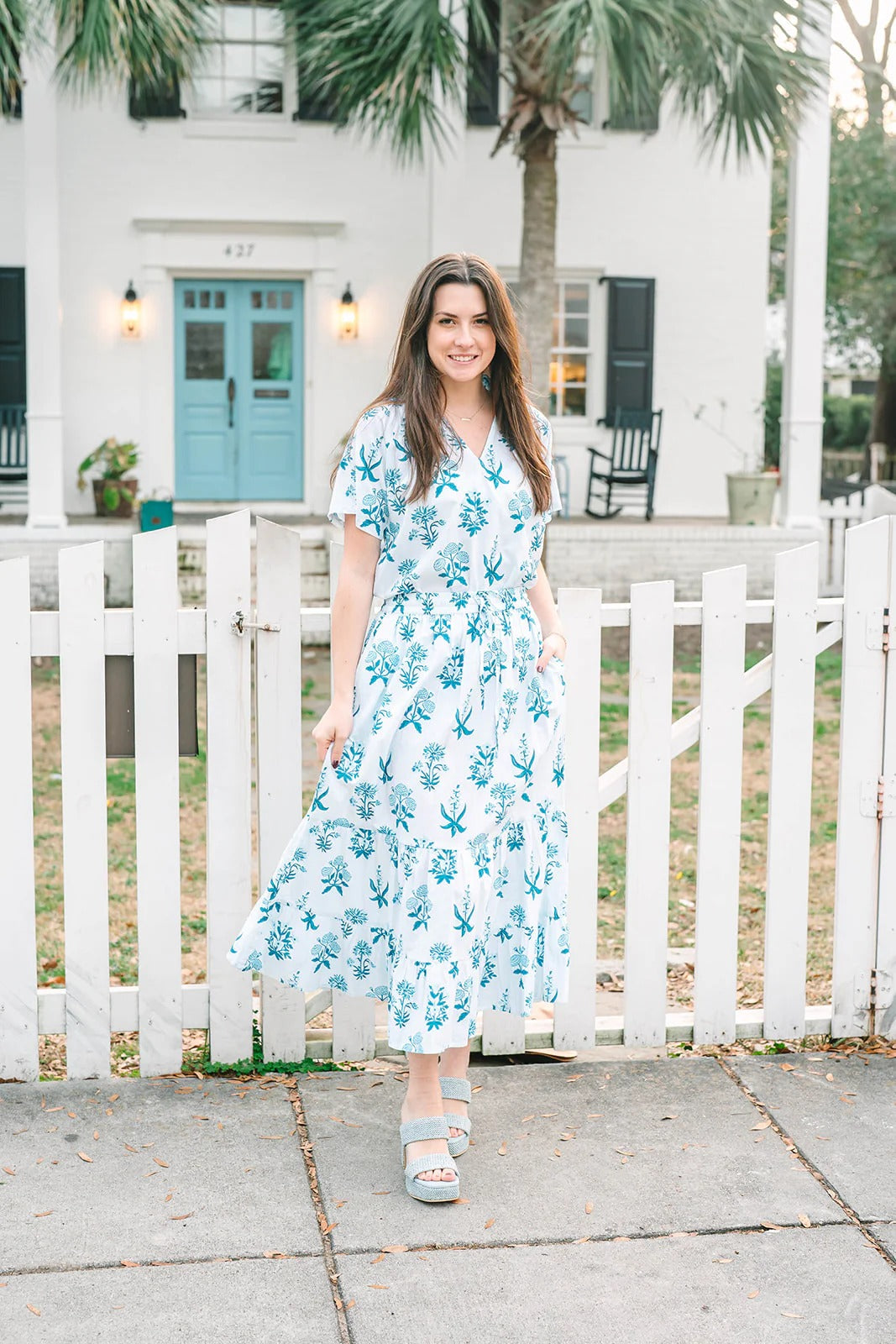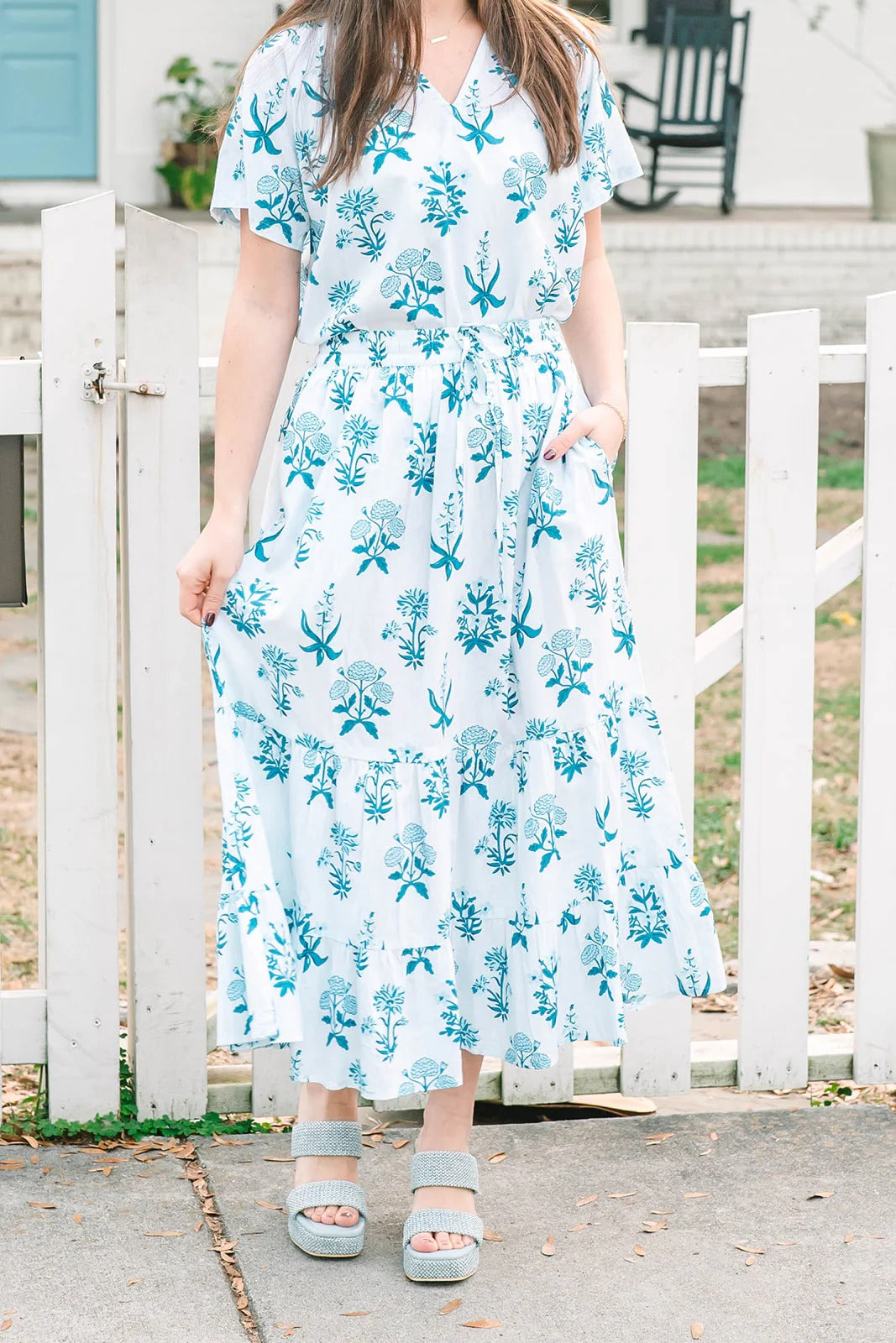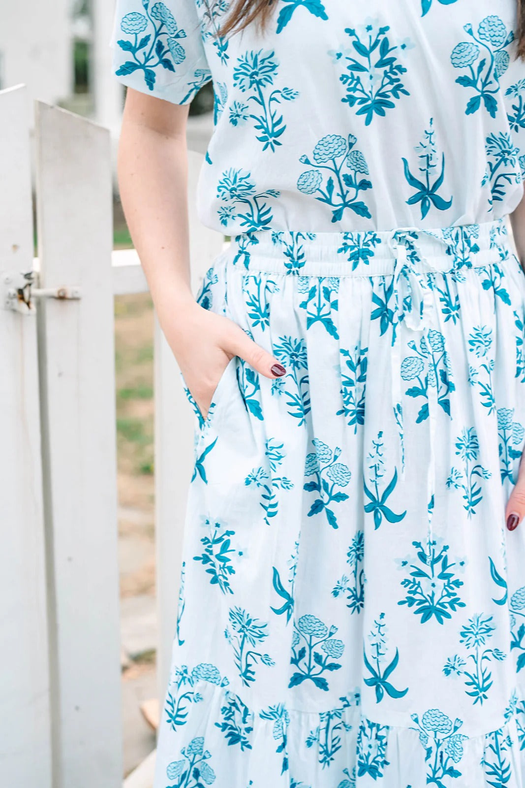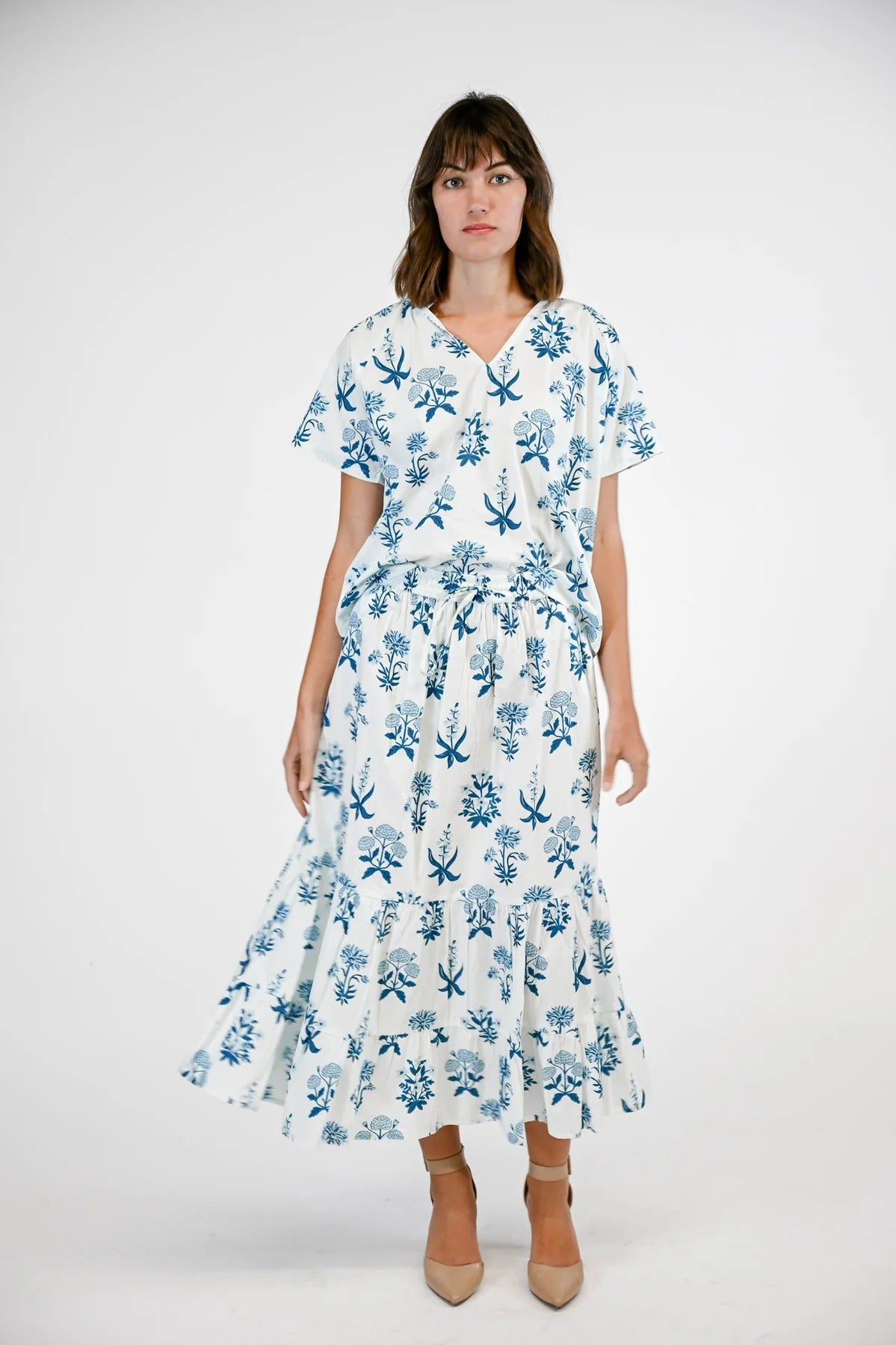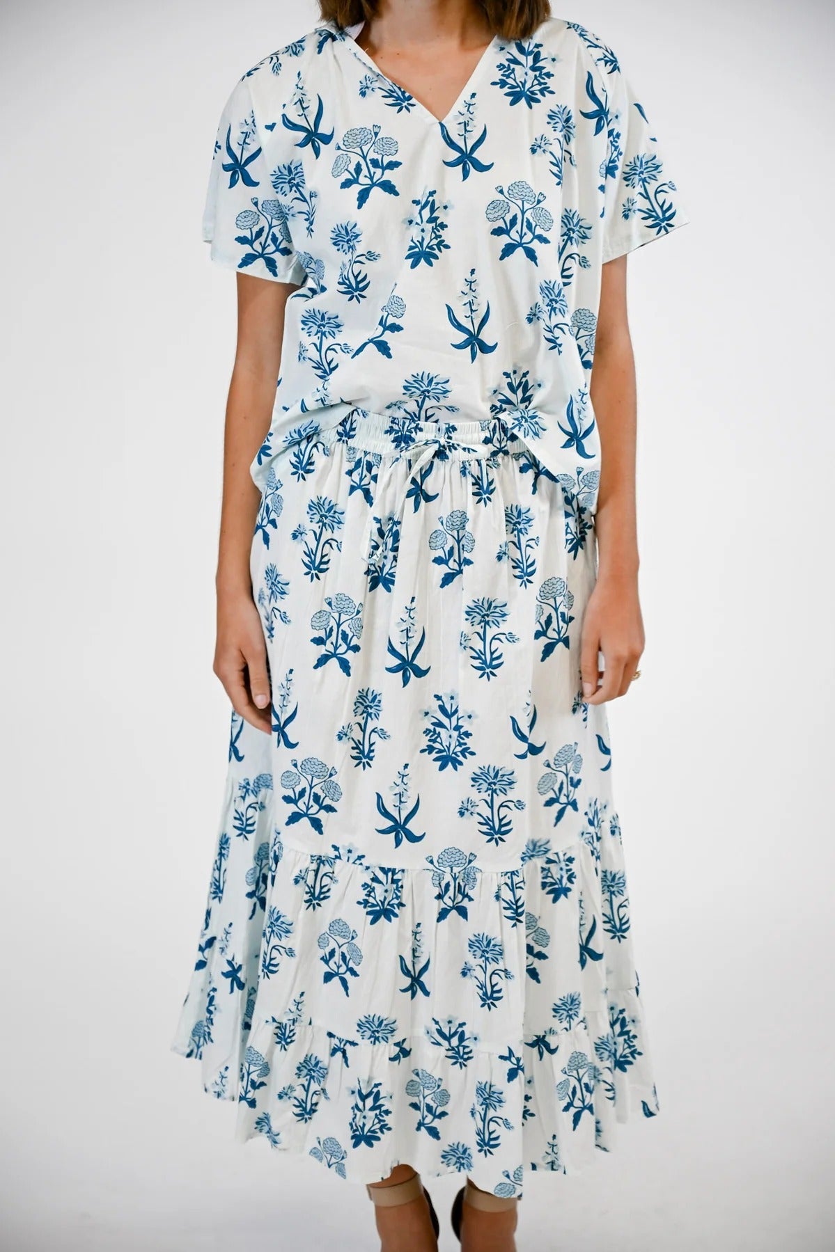 Embrace effortless elegance with the VICTORIA DUNN Olivia Skirt in the enchanting Indigo Meadow print. This stunning tiered maxi skirt showcases delicate blue botanical florals against a crisp white cotton poplin base, creating a dreamy garden-party aesthetic. The flowing three-tiered silhouette with gathered seams provides graceful movement and feminine charm, while the adjustable drawstring waist ensures a perfect, customizable fit for every body type. Hand-crafted by skilled artisans in Jaipur, India, this versatile piece pairs beautifully with the coordinating Olivia Blouse or your favorite fitted top for everything from weekend brunches to vacation strolls.