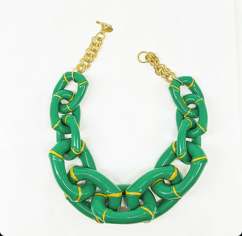 Make a bold fashion statement with Parker Kennedy "The Michelle" Bamboo Link Necklace. This stunning statement piece features chunky green enamel links with luxurious gold accents that create a sophisticated bamboo-inspired design. The substantial 2-inch thick links deliver impressive visual impact while remaining surprisingly wearable, making it the perfect conversation starter for everything from elevated casual looks to cocktail parties. The rich green color pairs beautifully with neutrals, blacks, and whites, while the gold detailing adds warmth and elegance to any ensemble.Details: