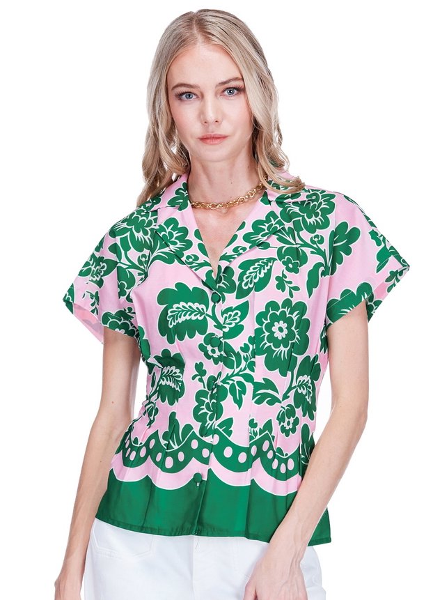 Embrace effortless spring style with the Joy Joy Waist Pleated Blouse. This stunning piece features a vibrant jade green floral print on a soft pink background, creating a feminine and fresh look perfect for the season. The relaxed fit through the body is beautifully defined by pleated detailing at the waist that creates a flattering silhouette without being restrictive. The lightweight fabric drapes beautifully and feels comfortable all day long. Style it with white jeans for a casual weekend look, or tuck it into a midi skirt for date night – this versatile blouse transitions seamlessly from day to evening.